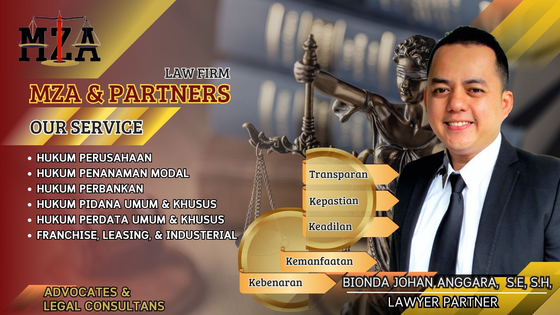 Kantor Hukum MZA & Partners merupakan Firma Hukum yang menjunjung tinggi Kualitas Layanan Hukum untuk membela kepentingan Klien atas permasalahan hukum yang dihadapi dengan berpedoman teguh pada nilai-nilai filosofi keadilan, kepastian dan kemanfaatan Hukum. Berdasar pada nilai-nilai filosofi itulah kami berupaya memberikan layanan jasa hukum terbaik untuk kepentingan klien baik layanan hukum Preventif (Pencegahan) maupun layanan hukum Represif (Pengendalian) yang dihadapi Klien dengan berbagai macam pilihan jalan keluar yang di tawarkan sesuai dengan Peraturan Perundang-Undangan yang berlaku serta teori dan prinsip hukum yang berlaku. Pada intinya, pilihan terbaik bagi Klien adalah menjadi tujuan kami.